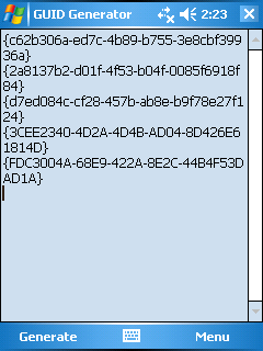 GUID Generator # Download: here Description # Simple GUID generator for Windows Mobile. It uses the Microsoft .NET GUID generation function. Screenshots #